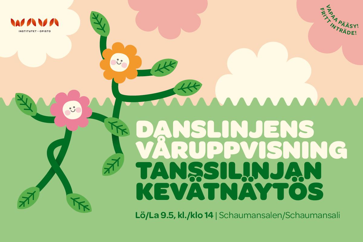 Välkomna till Danslinjens Våruppvisning lördagen den 9.5 kl. 14:00 i Schaumansalen 🌞 Temat för dansshowen i år är “Rötter”. Under uppvisningen uppträder Wava-institutets danselever med olika uppträdanden, allt från balett till nutidsdans, akrobatik och egna koreografier....