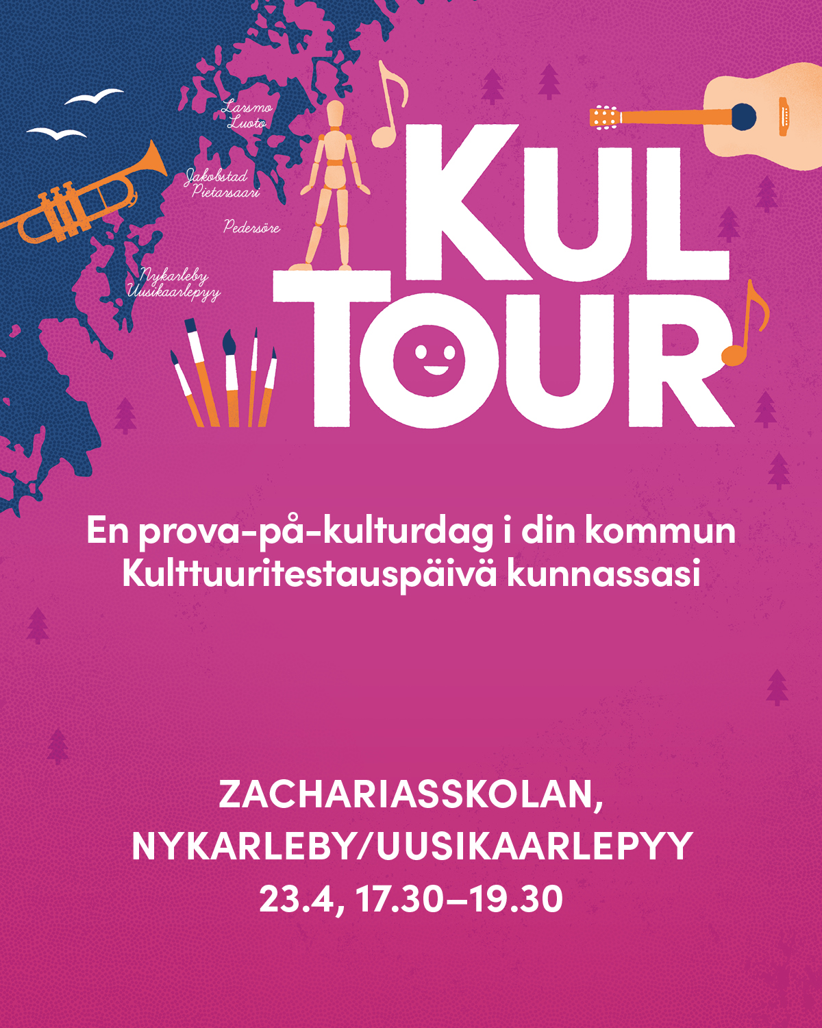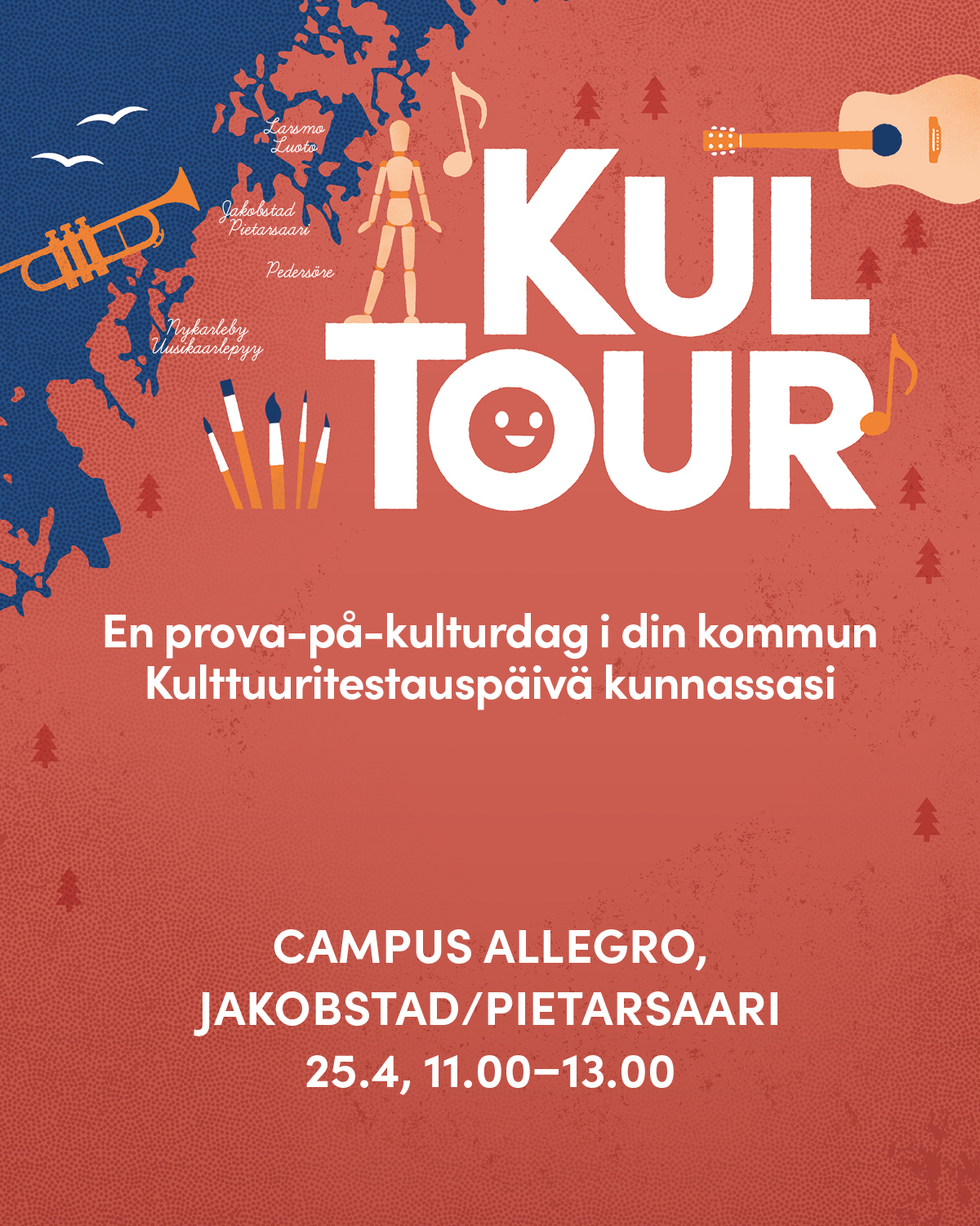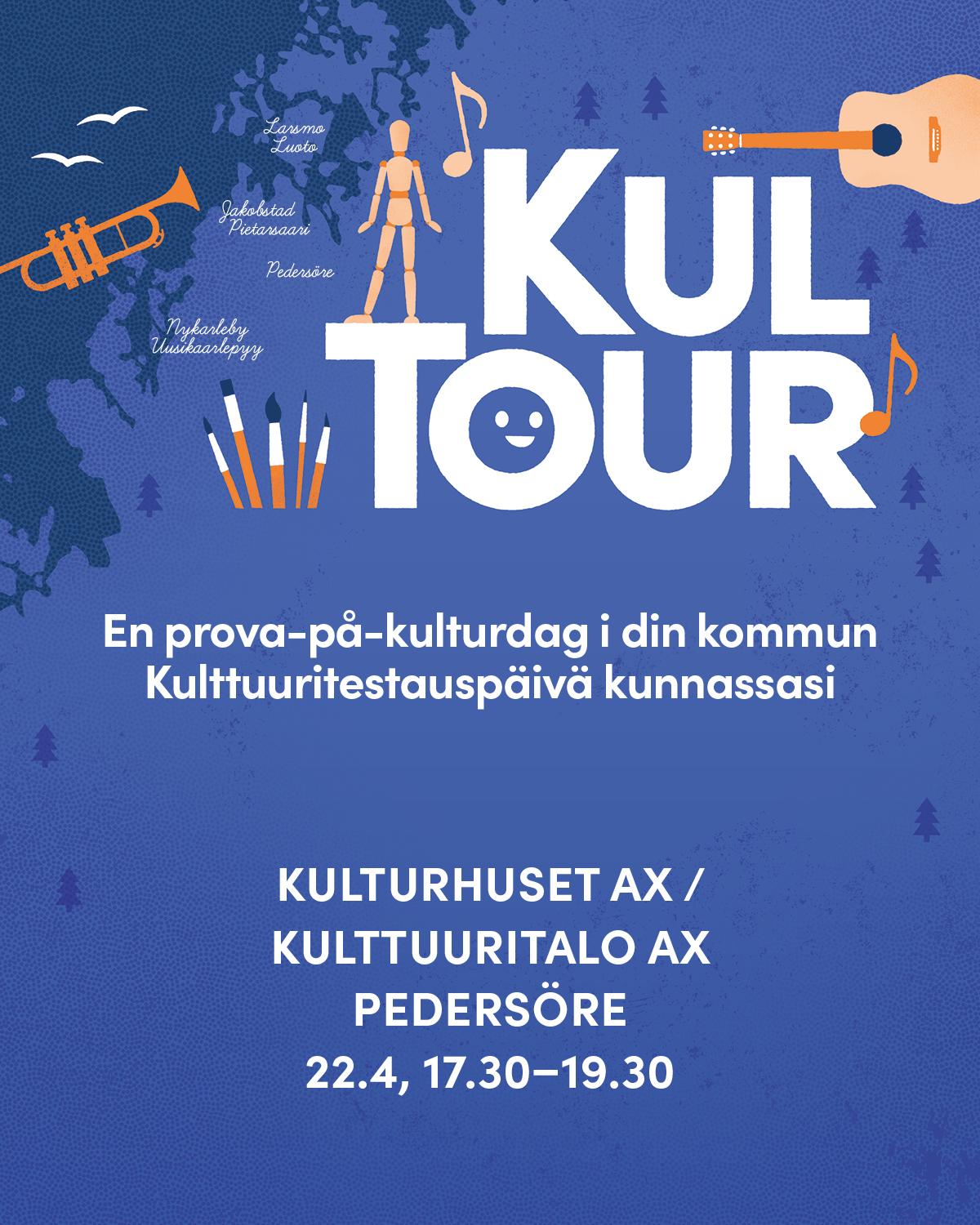 Tule kokeilemaan soittimia, osallistumaan taidepajoihin ja nauttimaan esiintymisistä! Tarjolla on myös tarjoilua ja lahjakorttiarvonta. KulTour on Wava-opiston ja SKAPA Pietarsaaren seutu -projektin kiertue Pietarsaaren seudun kuntiin. Kävijät voivat tutustua toimintaan seuraamalla ohjelmaa tai osallistumalla eri ohjelmanumeroihin. Interaktiiviset osuudet on suunnattu erityisesti lapsille ja nuorille. Järj. Pietarsaaren Sinfonietta,...
